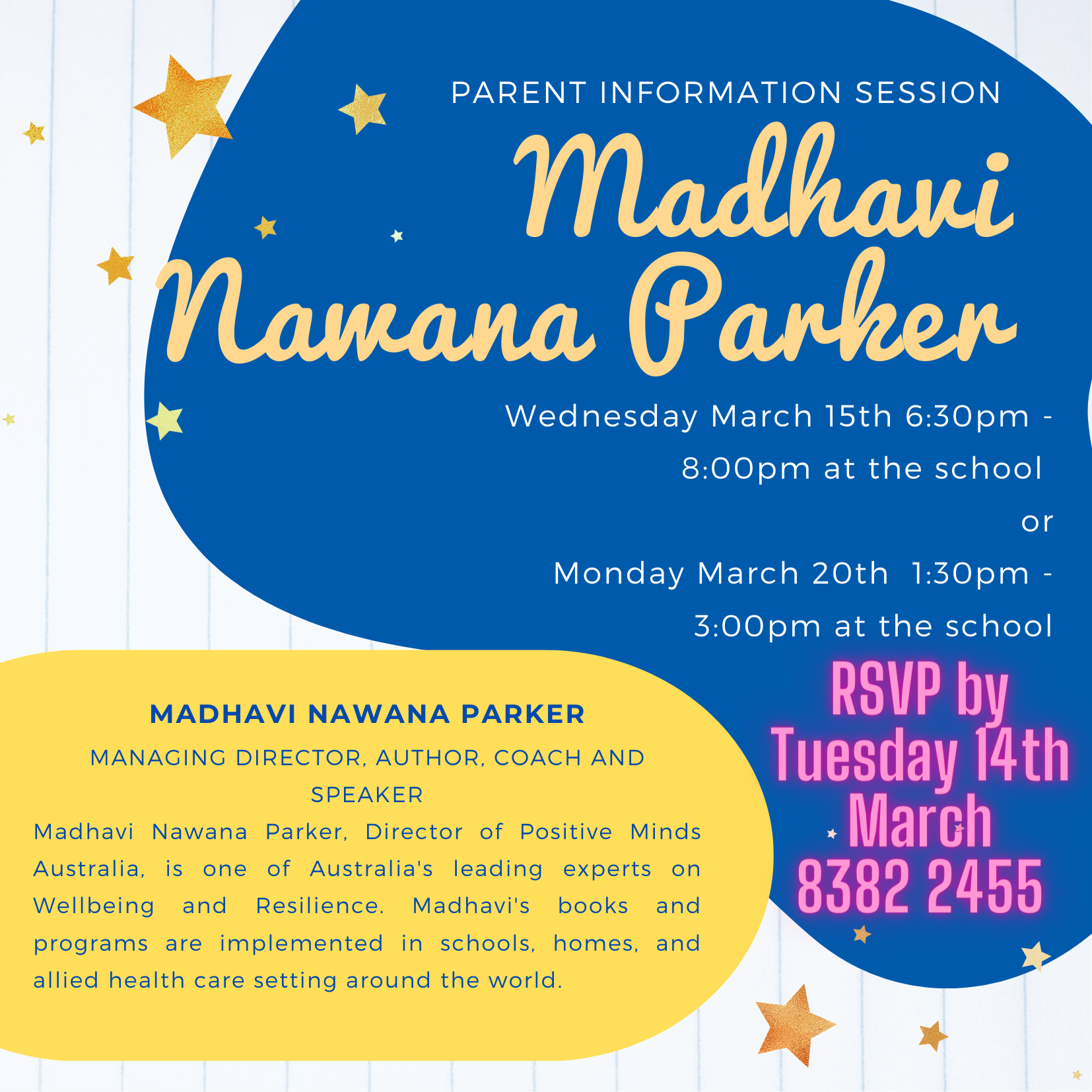 The sessions will be held in the gym or the library depending on the number of attendees. Please RSVP by phoning the school 8382 2455 or email.